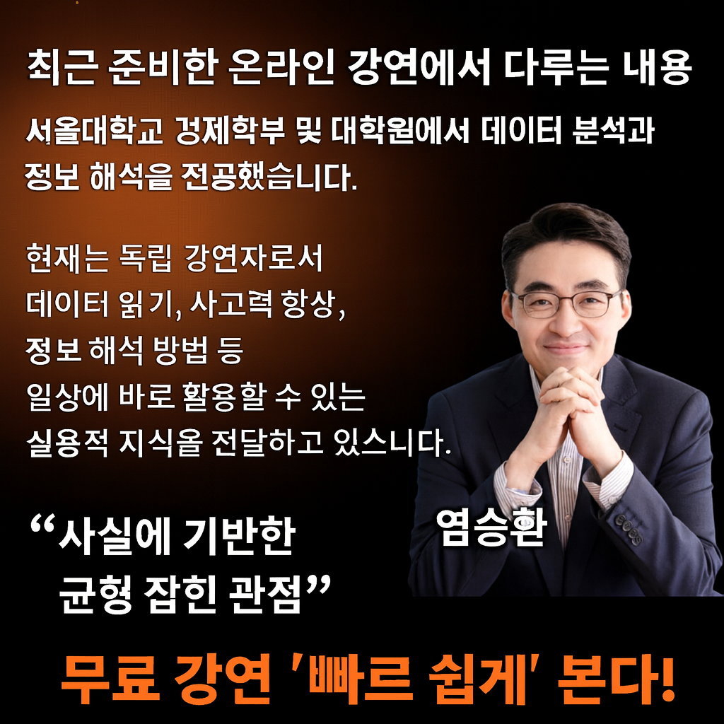 서울대학교 경제학부 및 대학원에서 데이터 분석과 정보 해석을 전공했습니다. 졸업 후에는 다양한 분야의 복잡한 정보를 쉽게 풀어 설명하는 콘텐츠 제작자로 활동해 왔습니다. 현재는 독립 강연자로서 데이터 읽기, 사고력 향상, 정보 해석 방법 등 일상에 바로 활용할 수 있는 실용적 지식을 전달하고 있습니다. “사실에 기반한 균형 잡힌 관점” 저는 과장된 내용 없이, 누구나 스스로 판단할 수 있는 힘을 기르는 교육을 가장 중요하게 생각합니다.